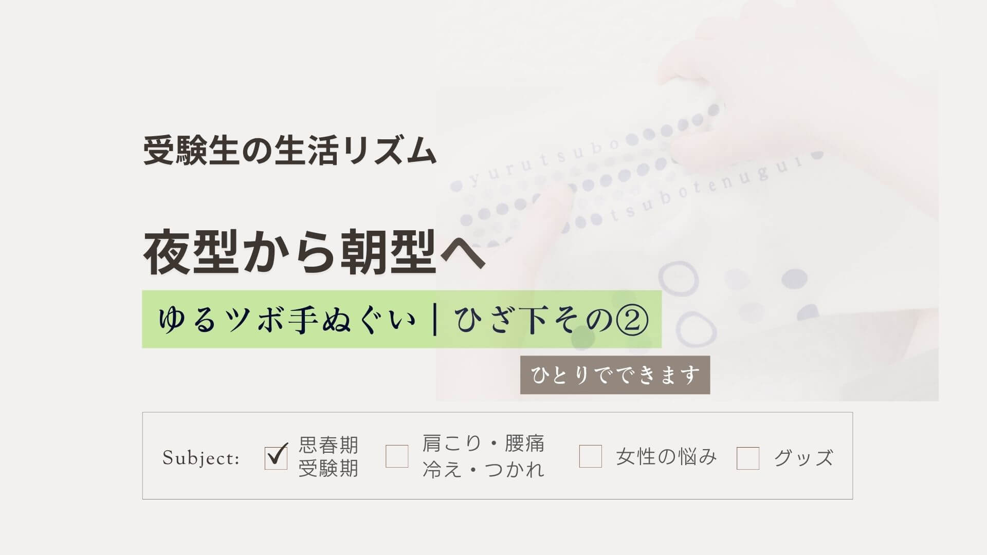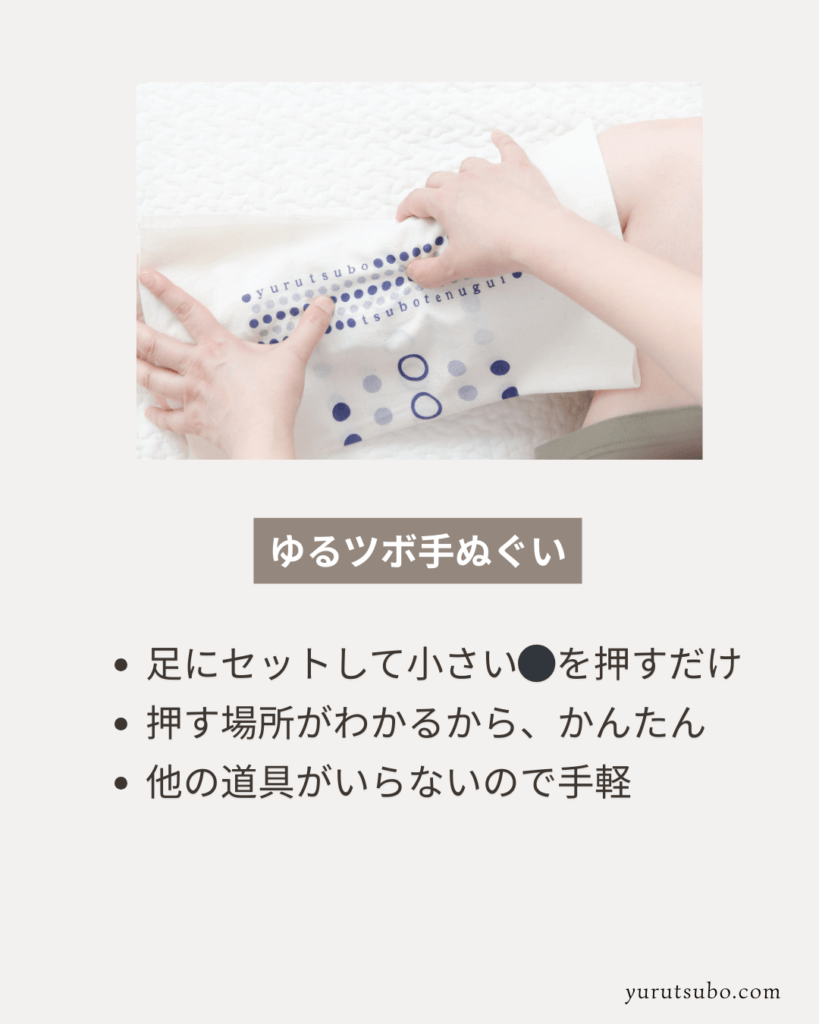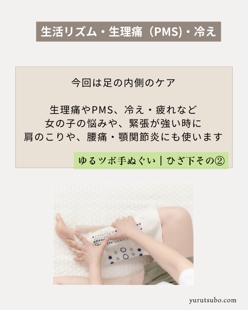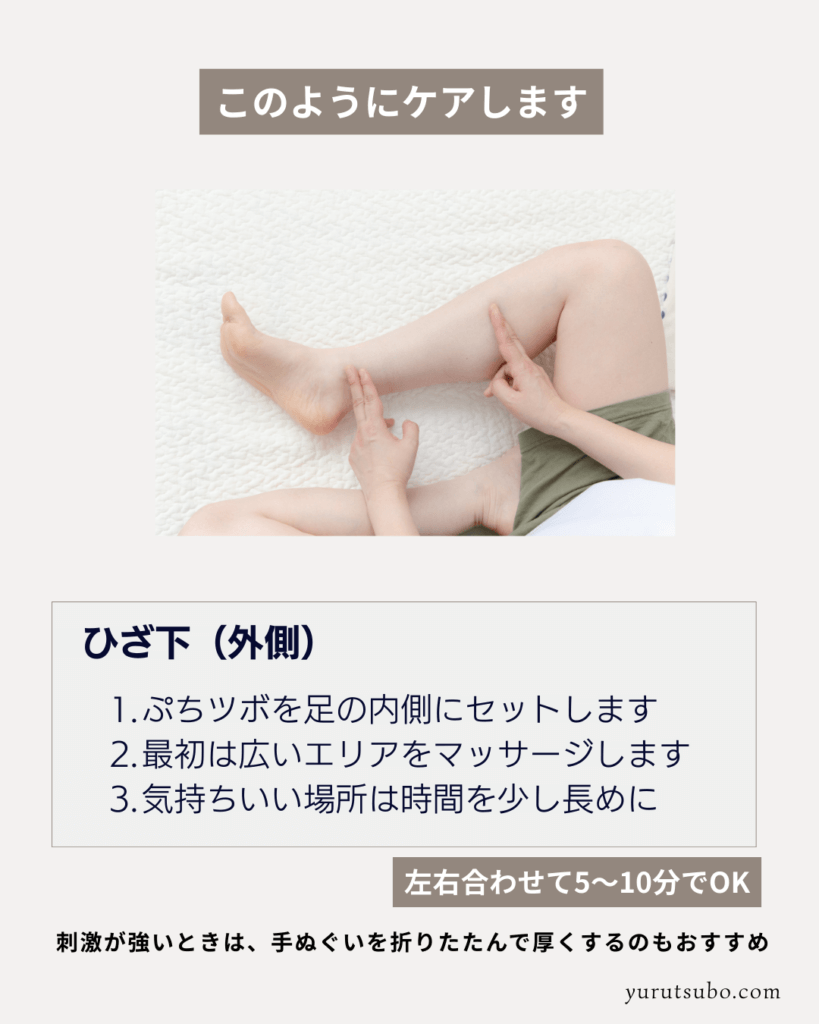 ひざ下の内側には、ゆるツボ手ぬぐいのぷちツボエリアを使います。